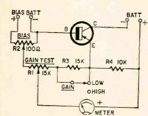 Este circuito de teste de transistores com polarização em ponte mede o ganho na faixa de 0 a 300. O c8ircuito é de uma Radio Electronics de junho de 1952.