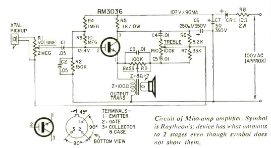 Este é um circuito com um novo componente (na época) lançado pela Raytheon de 1965. O circuito usa um transistor de efeito de campo de potência, um dos primeiros tipos usados. O circuito é de uma Radio Electronics de maio de 1965.