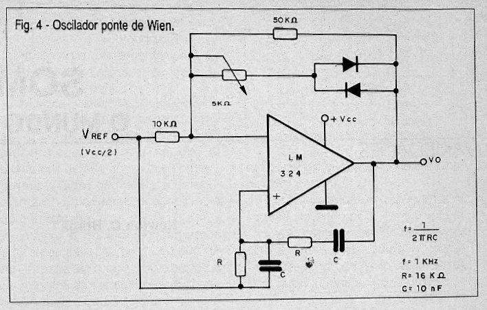 Este circuito produz um sinal senoidal cuja frequência pode ser calculada pela fórmula junto ao diagrama. Junto a esta fórmula temos os valores calculados para uma frequência de 1 kHz. A fonte de alimentação não precisa ser simétrica, mas sua tensão influi na distorção da forma de onda gerada, dando-se preferência a valores entre 12 e 15 V. O ajuste da simetria da forma de onda e de sua fidelidade é feito no trimpot. A tensão de referência pode ser obtida por meio de um divisor com dois resistores de 10k ohms em série.