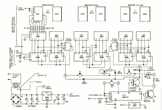 Encontrado numa revista Radio Electronics de novembro de 1977, este circuito digital foi descrito num artigo que o ensinava a montar. O circuito de 6 dígitos consistia num relógio.