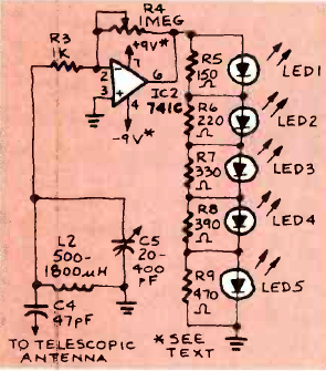 Este circuito pode ser usado para detectar os sinais do circuito anterior ou de qualquer transmissor de rádio. O circuito é de uma revista Radio Electronics de abril de 1982.