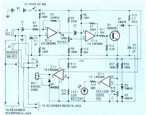 Este circuito saiu numa Radio Electronics de novembro de 1983. Trata-se de um acessório para ser usado no controle de gravações de modo que o gravador entre em ação apenas quando houver som. O circuito usa componentes comuns ainda hoje.