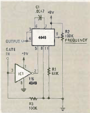 Este circuito com componentes comuns CMOS foi encontrado na revista Radio Electronics de novembro de 1984. O circuito tem a frequência básica determinada por C1.