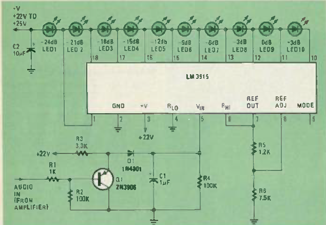 Este circuito bargraph com o LM3914 foi encontrado na revista Radio Electronics de outubro de 1980. Observe o uso de um transistor para modificar a resposta.
