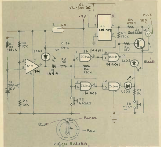 Este circuito é de uma Radio Electronics de março de 1985. O circuito usa componentes comuns na época e LEDs como indicadores. A alimentação é feita com9 9V.