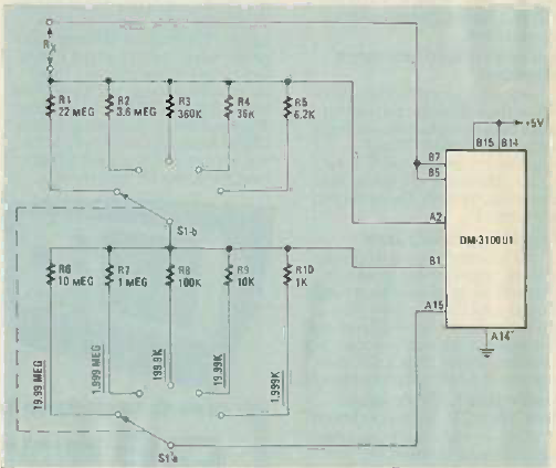 Este circuito de medidor de resistências foi encontrado na revista Radio Electronics de fevereiro de 1984. Ele tem por base um módulo digital da época. A alimentação é de 5 V.