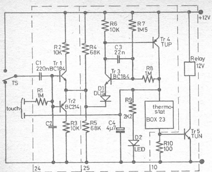 Esta chave de toque com opção mecânica foi encontrada numa documentação inglesa antiga. Os transistores podem ser equivalentes modernos. O acionamento é feito com relé.