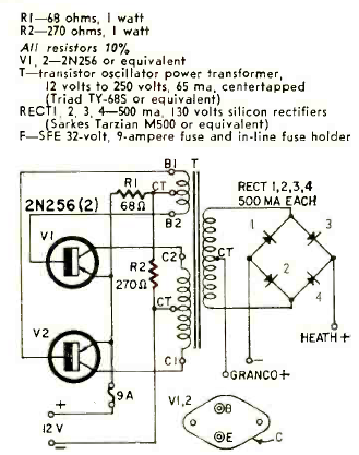 Encontrado na revista Radio Electronics de novembro de 1960. O circuito gera alta tensões contínuas para aplicações valvuladas. Os transistores devem ser dotados de dissipadores de calor.