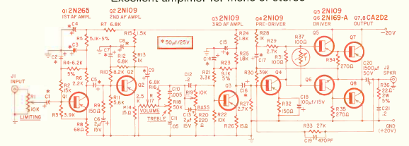 Utilizando transistores da época, este amplificador de 10 W foi encontrado na revista Radio Electronics de maio de 1963. Os transistores de potência devem ser montados em dissipadores de calor.