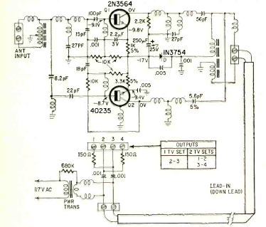 Este booster para TV em VHF antigo e que também serve para FM foi encontrado na revista Radio Electronics de abril de 1967. Os transistores são da época e ele trabalha até 890 MHz que é o extremo da faixa de UFH da época.