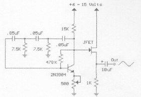 Este circuito usa dois transistores para obter sinais senoidais de baixa frequência. Encontramos numa documentação de 1990. Transistores equivalentes podem ser usados. A frequência com os valores indicados está em torno de 600 Hz.