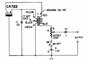 Este oscilador de bloqueio foi encontrado numa publicação dos anos 50. As bobinas determinam a frequência. O circuito usa um transistor CK722, de germânio.
