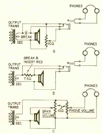 Na figura tempos três circuitos para se usar fones de ouvidos em amplificadores com alto-falantes que não tenham saídas adicionais. O circuito é de uma Radio Electronics de dezembro de 1961.