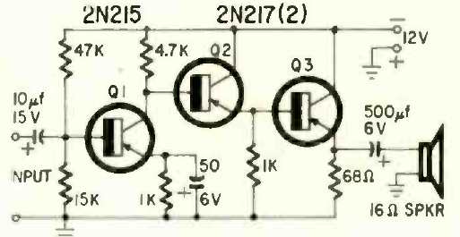 Este circuito para alto-falante de 16 ohms sem transformador foi encontrado numa Radio Electronics de outubro de 1963. O circuito é alimentado por 12 V e o ganho é de 50 dB.
