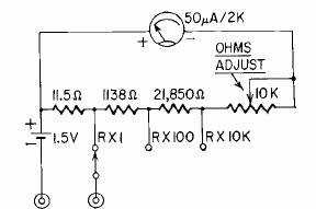 Combinado com os dois circuitos anteriores, podemos elaborar com este circuito um simples multímetro. O cálculo dos componentes é feito para um instrumento de 50 uA com resistência de 2k. A seleção de faixas é feita por chave e a alimentação por pilha.