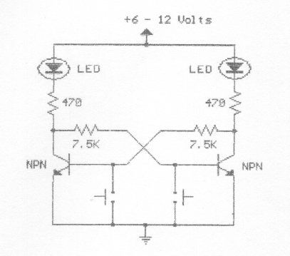 Este circuito é de uma documentação dos anos 90. O circuito é simples, pois usa apenas dois transistores e o controle é feito por interruptores de pressçao. A indicação é feita por LEDs.