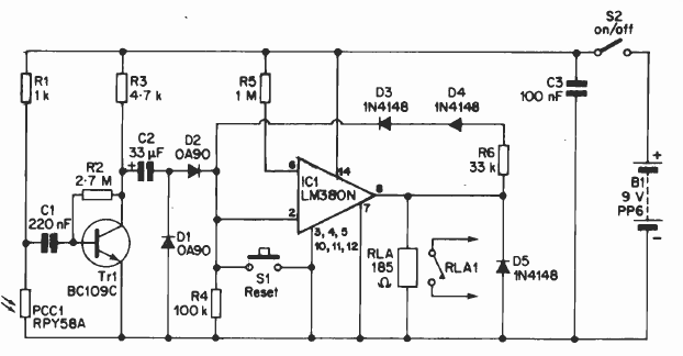 Este circuito detecta somente variações da luz que incide sobre o sensor. O circuito usa um LM380 como base, tendo sido encontrado numa documentação dos anos 90. O sensor é um LDR.