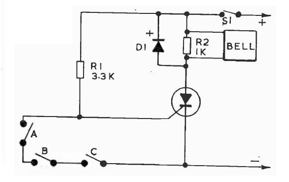 Esta é uma das muitas versões que temos deste alarme no nosso site. Foi encontrada numa documentação inglesa. R1 pode ser de até 100k para menor consumo do circuito. O número de sensores pode ser aumentado.