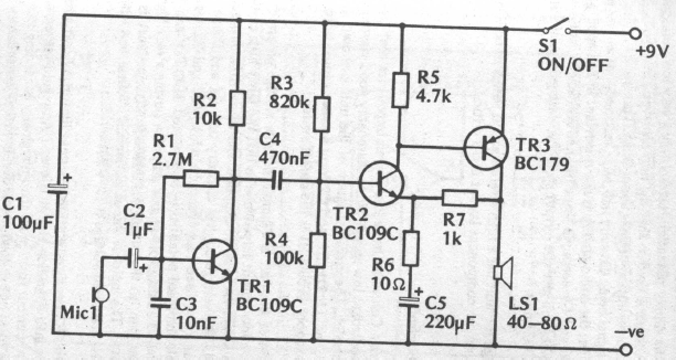 Este circuito foi encontrado numa documentação inglesa de 1989. Os transistores admitem equivalentes de uso geral. O microfone é do tipo sensível de cristal ou cerâmico.