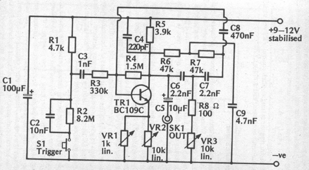 Este circuito gera um sinal que lembra o som de um triângulo. Encontramos numa documentação inglesa de 1989. O transistor pode ser um BC548. O sinal deve ser aplicado a um amplificador externo.