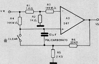 A existência de transistores de efeito de campo na entrada do circuito integrado (amplificador operacional) desta aplicação possibilita sua utilização em timers de longos períodos. De fato, a constante de tempo obtida com resistores de 144 M ohms (7 resistores de 22 M ohms em série) juntamente com o capacitor de 10 uF de policarbonato, nos leva a uma temporização de 1 000 segundos. O circuito integrado deve ter alimentação simétrica e a chave clear serve para descarregar o capacitor no início de uma nova temporização.