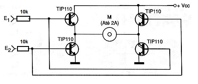 Uma ponte de maior sensibilidade e, portanto, menor consumo para as saídas do microcontrolador é a mostrada a seguir, fazendo uso de transistores Darlington. Esta ponte tem 4 estados possíveis, 00 para o motor parado, 01 e 10 para os dois sentidos de rotação e o estado proibido 11 que leva todos os transistores à condução e com isso uma situação de curto-circuito. Os transistores devem ser dotados de dissipadores de calor. A alimentação separada para os motores pode ficar entre 3 e 15 V.