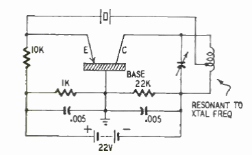 Este circuito controlado por cristal com 60 mW de potência está na revista Radio Electronics de 1950. A frequência é no máximo de uns 100 kHz.