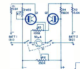 Este circuito de adaptador para medida de tensões foi encontrado na Radio Electronics de abril de 1966. O sensível instrumento de 50 uA pode ser substituído pela escala mais baixa de corrente de um multímetro comum.