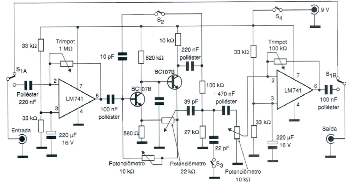 O circuito apresentado produz um efeito de distorção denominado "underground- (subterrâneo), sendo relativamente simples. A chave S A serve para inserir ou retirar o circuito distorcedor. A chave S1 de 2 polos x 2 posições leva o sinal da entrada para a saída numa posição. Na posição 2, o sinal de entrada passa pelo circuito distorcedor. Nesta posição o sinal passa por um amplificador operacional 741.