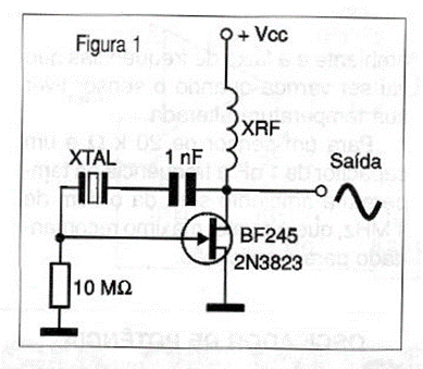 O oscilador ilustrado na figura pode ser usado para gerar sinais que vão desde 100 kHz até algumas dezenas de megahertz, dependendo do cristal utilizado. A alimentação pode ser feita com tensões de 9 a 15 V e o capacitor em série com o cristal deve ser cerâmico. O choque de RF é de 1 mH para uma frequência entre 100 kHz e 1 MHz podendo ser reduzido para frequências maiores. O transistor de efeito de campo de junção (JFET) admite equivalentes como o BF245 e o MPF102.