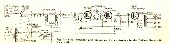 Este efeito de reverberação foi encontrado na revista Radio Electronics de dezembro de 1961. Ele faz uso de molas e inclui a fonte de alimentação e o amplificador de potência.