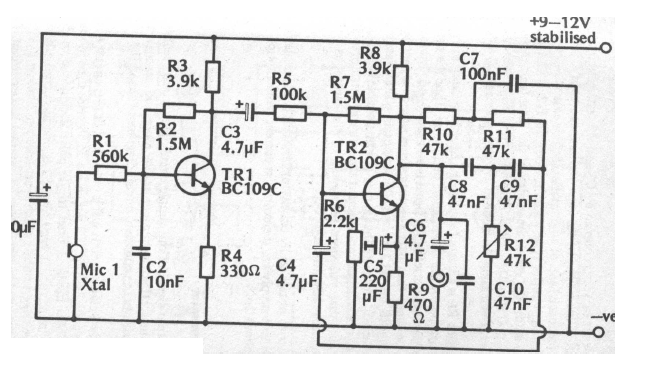 Encontrado numa publicação inglesa dos anos 80, este circuito pode ser elaborado com transistores equivalentes como o BC549. O sinal deve ser aplicado a um amplificador externo.