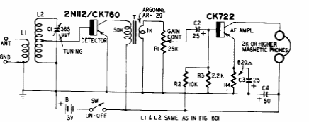 Encontramos este circuito numa documentação americana dos anos 60. Os transistores são de germânio e o fone deve ser de alta impedância. Veja a bobina no circuito anterior.