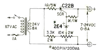 Este circuito usa um SCR como retificador e controla pera a carga de uma bateria de 7 a 24 V. O circuito é de uma Radio Electronics de junho de 1964. SCRs como TIC106 podem ser usados. O potenciômetro de controle é de fio.