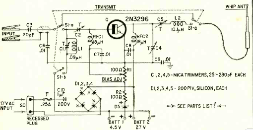 A finalidade deste circuito é aumentar a potência e o alcance de um walkie talkie pequeno. O circuito é de uma Radio Electronics de março de 1967. O transistor de RF é da época. Observe o uso de uma bateria de 27 V, pouco comum em nossos dias.