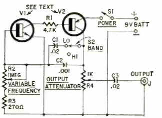 Este injetor de sinais transistorizado foi um dos primeiros que encontramos usando a conhecida configuração de dois transistor complementares. Saiu numa Radio Electronics de abril de 1952 e era alimentado por bateria de 9V.