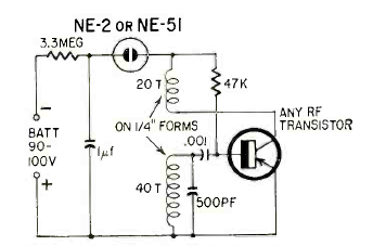 Este circuito diferente foi encontrado numa Radio Electronics de agosto de 1965. Ele trabalha com uma tensão de 90 V que vem de uma bateria especial da época, mas pode usar uma fonte de mesma tensão. O consumo é extremamente baixo.