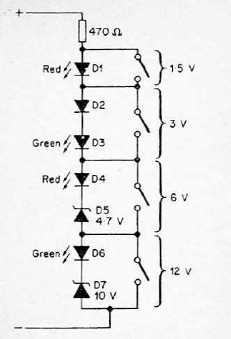 As saídas de cada posição da chave são determinadas pela tensão zener mais a tensão de condução de cada LED. A tensão de entrada tem de ser maior do que a tensão total das saídas.