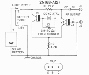 Este circuito foi encontrado em documentação dos anos 50. O circuito usa transistores da época e gera sinais de 100 kHz determinados pelo cristal. Os transistores são de germânio.