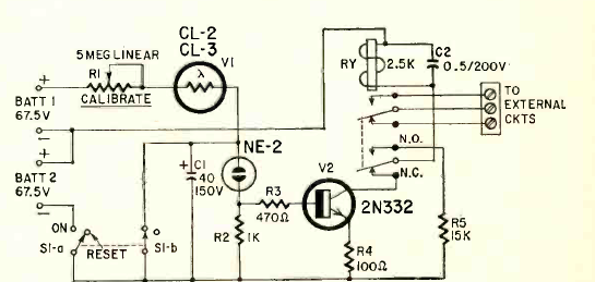 Este timer com 1 transistor foi publicado na revista Radio Electronics de dezembro de 1960. O circuito tem contatos reversíveis e recursos de trava sendo alimentado por bateria.