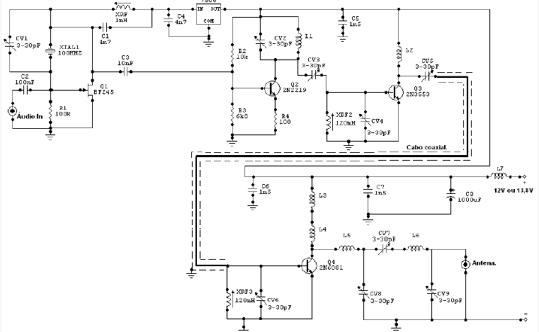 O transmissor apresentado pelo nosso leitor colaborador Adriano Muniz Moura tem uma potência de 10 watts e pode ser usado para ajudar a sua comunidade a divulgar notícias, avisos e etc. Porém para usar este tipo de equipamento é aconselhável ler as restrições legais para este tipo de transmissor. O transistor usado como oscilador principal foi um BF245 que é um transistor de efeito de campo e todos os demais transistores devem ter dissipadores de calor e para uma melhor estabilidade o transistor de saída final 2N6081 deve ter um pequeno ventilador para diminuir sua temperatura. A alimentação deve vir de uma fonte externa com uma tensão entre 12V e 13,8V com uma corrente de no mínimo 10A.