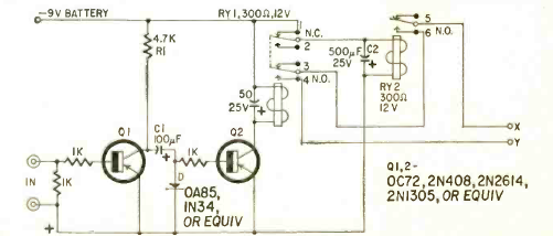 Este circuito foi encontrado numa Radio Electronics de agosto de 1967. O relé tem tensão de acordo com a alimentação do circuito e ele é destinado a comutação de velocidade de um toca-discos na aplicação original sugerida pela revista.
