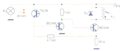 Este circuito faz uso de dois transistores numa configuração de acoplamento direto, e aciona diretamente um relé cujas características dependem da tensão de alimentação usada. A corrente de acionamento do relé deve ser no máximo de 50 mA, devendo ser considerada a queda de tensão no resistor de realimentação de 10 Ω. A fonte de luz é uma pequena lâmpada de baixa tensão, que tem sua luz focalizada no fototransistor a uma distância de até 3 cm. Fontes mais potentes e recursos ópticos podem aumentar esta distância. O resistor de 1 k ohm, eventualmente, pode ser alterado conforme as características de acionamento desejadas para o circuito. Na figura temos o diagrama completo deste detector de passagem.