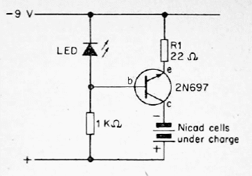 O transistor deste circuito pode ser um BD135 ou TIP31. A corrente de carga é dada pelo resistor R1. Neste caso, 50 mA. O circuito é de uma documentação antiga.