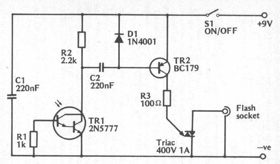 Este circuito, para máquinas antigas, dispara um segundo flash com a luz recebida com o primeiro, fornecendo assim dois focos de luz simultâneo. Os componentes admitem equivalentes.