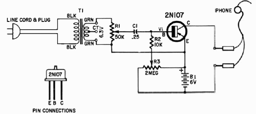 Sugerido por uma publicação de 1966, este circuito aplica um sinal de 60 Hz a um transistor para testar seu desempenho como amplificador. O transistor é de germânio. O fone é de alta impedância.