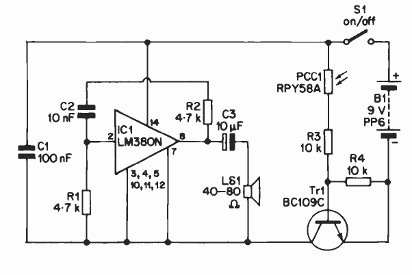 Este circuito dispara um oscilador com o LM380, produzindo um tom de áudio com luz incide no LDR. O circuito é de publicação antiga e o transistor pode ser o BC548.