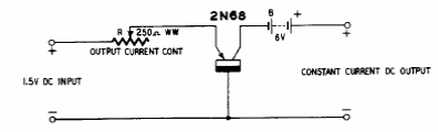 Esta simples configuração de controle de corrente foi encontrada numa documentação dos anos 60. O transistor de baixa corrente é da época. Podem ser utilizados equivalentes modernos. Neste circuito a corrente máxima é de 50 mA.