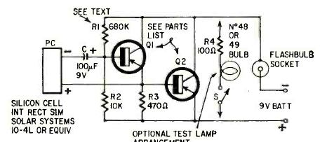 Este circuito para flashes antigos com lâmpada de xenônio foi encontrado numa revista Radio Electronics de junho de 1966. O sensor é uma célula fotoelétrica da época. A alimentação é feita por bateria de 9 V.