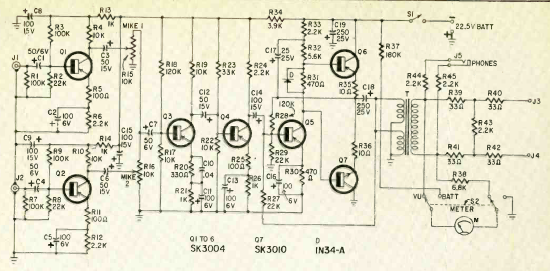 Este bem elaborado circuito foi publicado na revista Radio Electronics de agosto de 1967 num artigo que ensinava como fazer sua montagem. Os transistores são da época e o circuito é alimentado por uma bateria de 22,5 V.